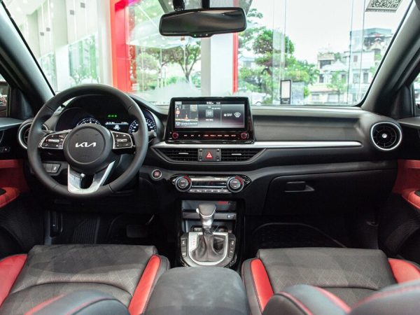 Cabin xe KIA K3 1.6 Turbo GT sử dụng tông đen sang trọng với điểm nhấn là các viền chỉ đỏ nổi bật. Hàng ghế trước có logo GT màu đỏ được thêu nổi trên lưng ghế, thiết kế vô lăng D-cut thể thao, ốp bàn đạp kim loại sáng bóng, chụp cần số thêu chỉ đỏ là những điểm nhấn tạo nên dấu ấn giúp phân biệt với các phiên bản trước.