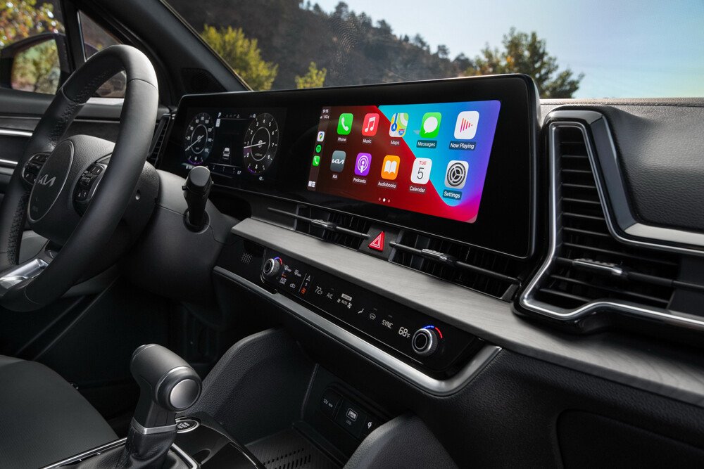 KIA Sportage Hybrid mới sử dụng màn hình giải trí 12,3 inch cho phép kết nối với điện thoại thông minh qua Apple CarPlay/Android Auto. Đầu ra của hệ thống giải trí trên Sportage là dàn âm thanh vòm Harman Kardon có công suất 320W.