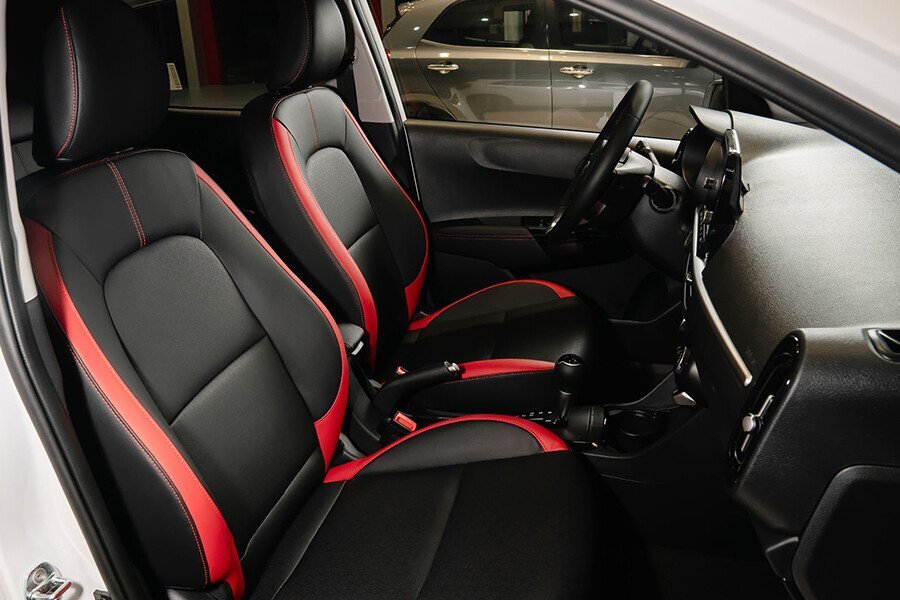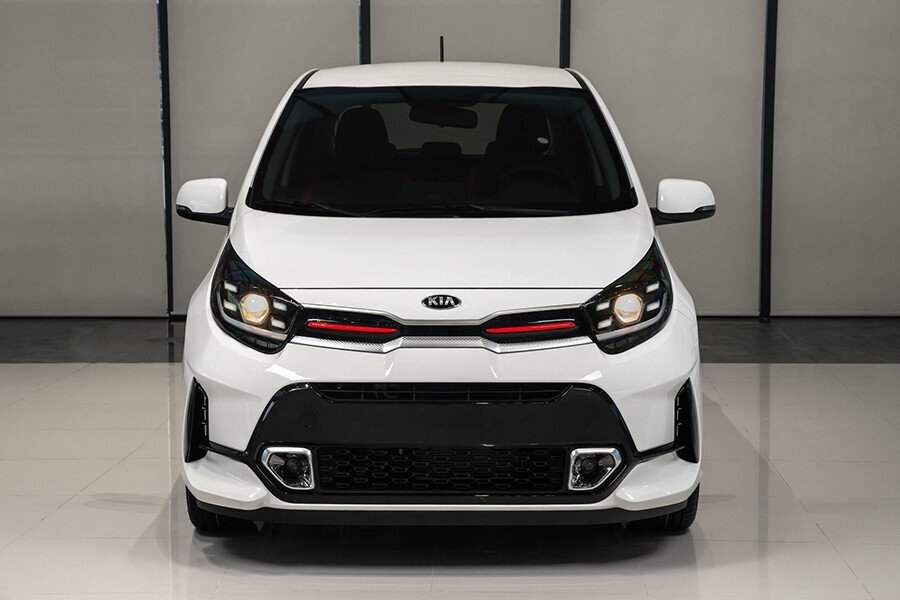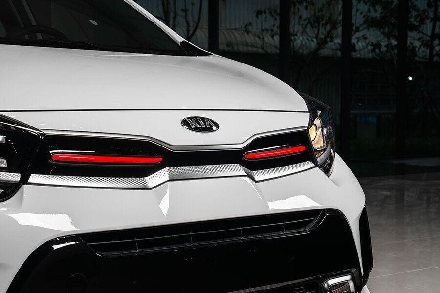 Ngay từ phần đầu xe, KIA Morning 2021 đã tạo ấn tượng với trang bị lưới tản nhiệt hình mũi hổ đặc trưng được tinh chỉnh với viền mạ crôm bao quanh kéo dài đến cụm đèn pha cũng được tái thiết kế. Đặc biệt, bản KIA Morning GT-Line này còn có thêm chi tiết trang trí màu đỏ ở giữa lưới tản nhiệt, viền trang trí dạng kim loại thiết kế ấn tượng giống trên mẫu xe KIA Seltos. Dải đèn LED ban ngày gồm 4 bóng đèn bao quanh đèn chính dạng gương cầu trông thiết kế hiện đại.