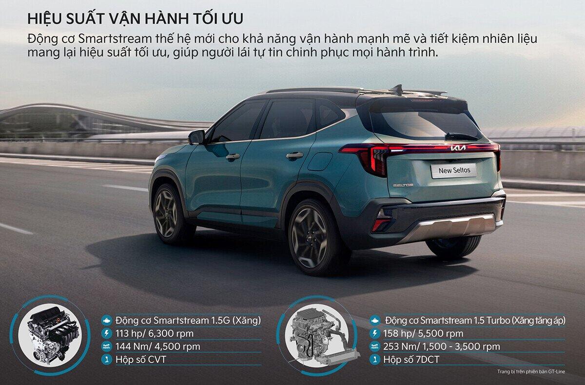 Phiên bản GT-Line dùng động cơ xăng Smartstream 1.5 Turbo mang tới công suất 158 mã lực tại 5.500 vòng/phút, mô-men xoắn cực đại 253 Nm từ 1.500-3.500 vòng/phút. Hộp số tự động ly hợp kép 7 cấp DCT. Seltos 2024 có 3 chế độ lái Normal, Eco, Sport và 3 chế độ địa hình Snow, Mud, Sand.