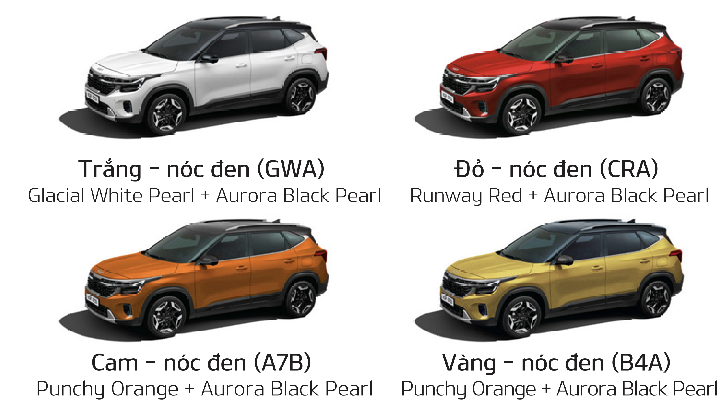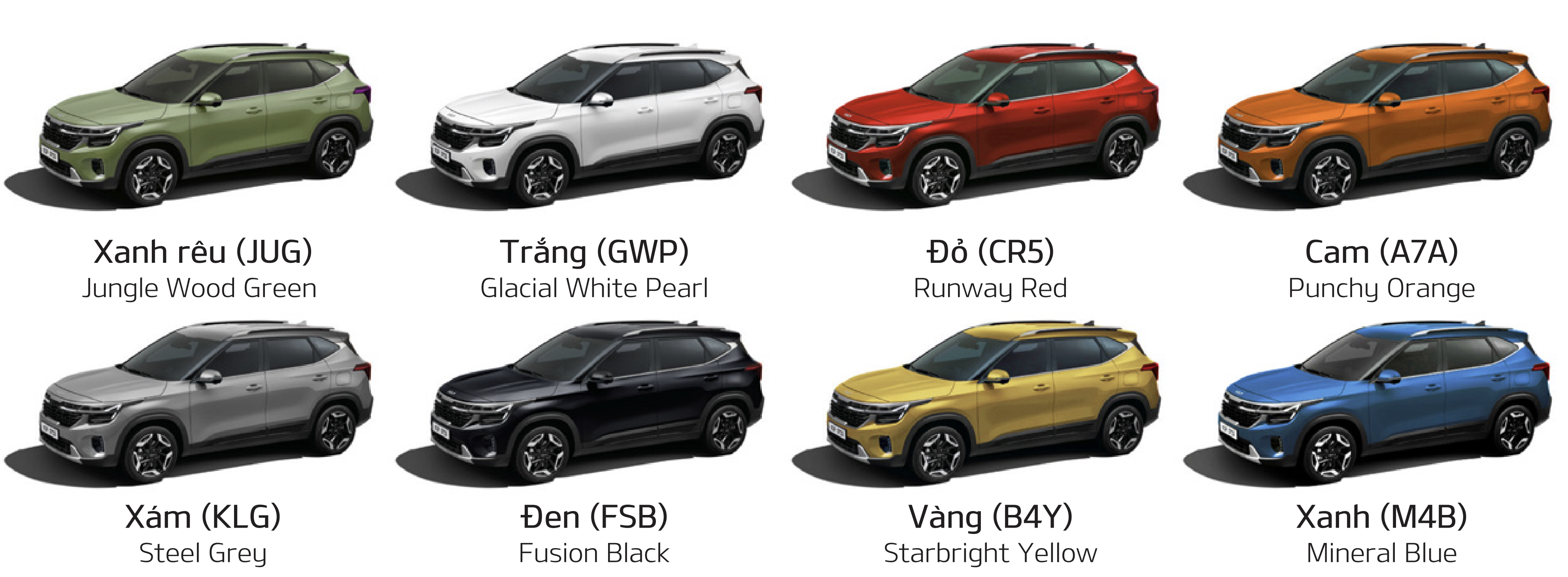 Ở thị trường Việt Nam, Kia Seltos 2024 có 12 tùy chọn màu sắc gồm: Xanh lá, Cam, Đen, Đỏ, Trắng, Vàng, Xám, Xanh, Cam đen, Đỏ đen, Trắng đen & Vàng đen.